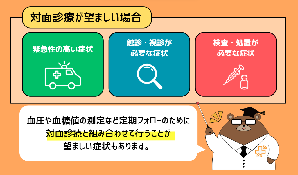 オンライン診療では、緊急対応や触診・処置などが行えないためいくつかの場合では対面診療が推奨されます。