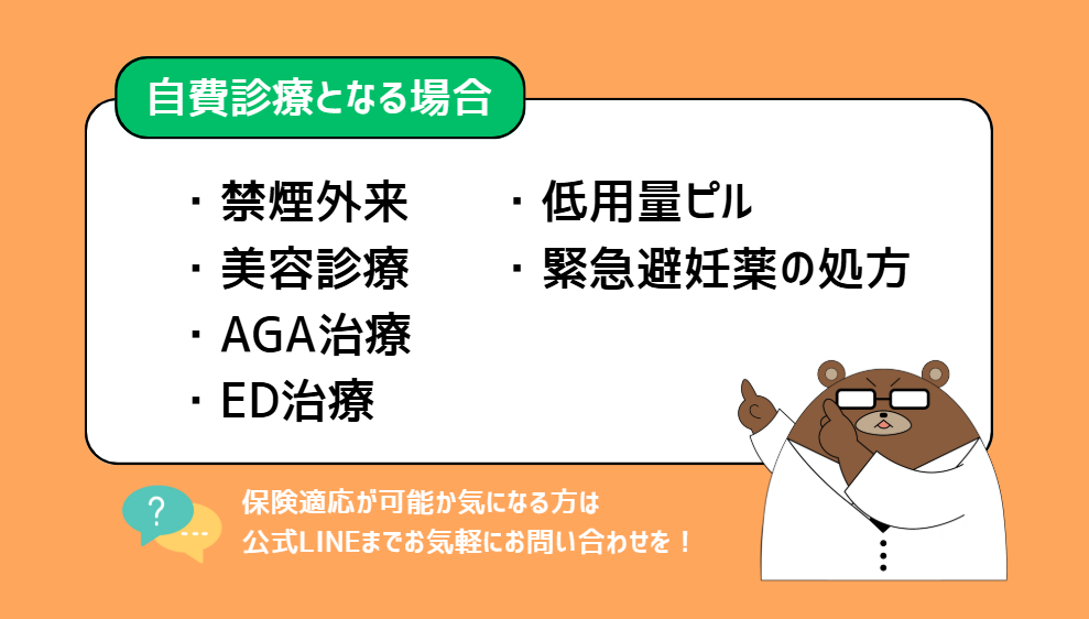 保険適応が受けられず、自費での診療となる場合には以下の場合があります。