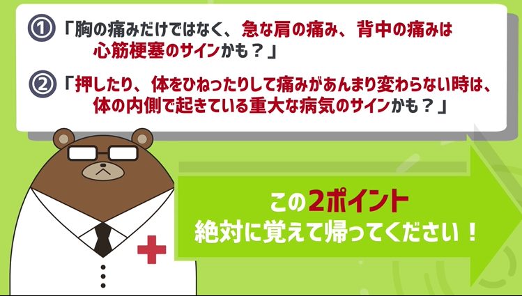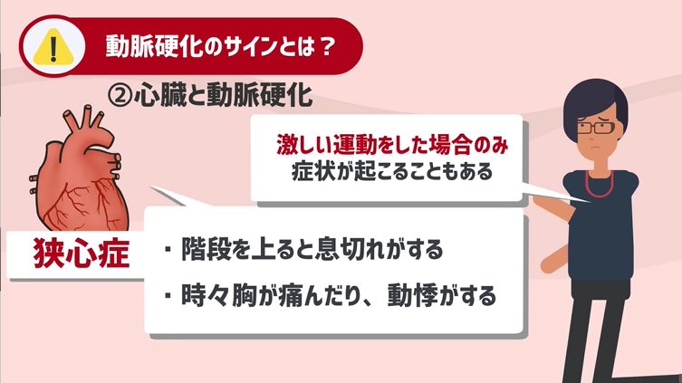次に、脳から下に下に下がっていき、次は心臓の動脈硬化、こちらはどのような症状が出るか見てみましょう。