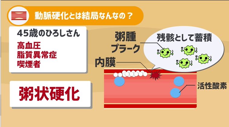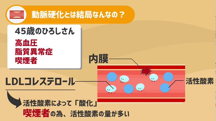 例えば、高血圧と脂質異常症持ち、そして喫煙者の45歳のひろしさん。ひろしさんお体の中ではどんな変化が起こりうるでしょうか。