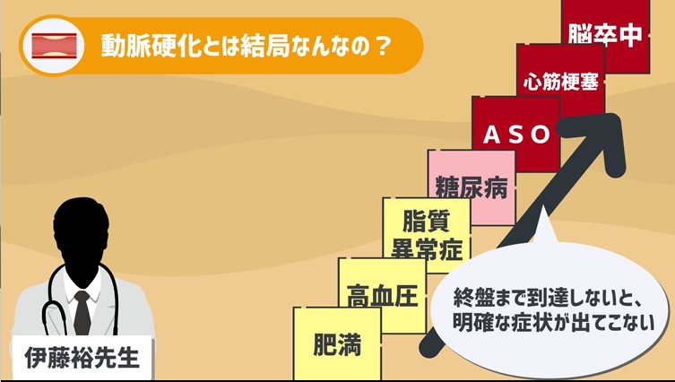 そして動脈硬化の非常にいやらしいポイントとしては、最終的にドミノ倒しの終盤まで到達しないと、明確な症状が出てこない事なんですね。