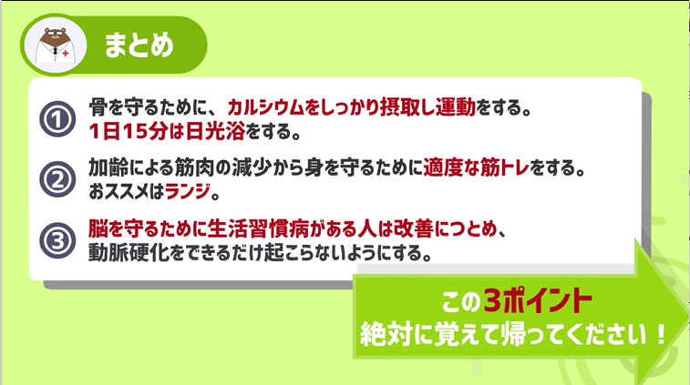 - 骨を守るために、カルシウムをしっかり摂取し運動をする。1日15分は日光浴をする。