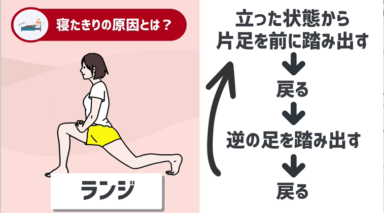 おススメなのは「ランジ」といって、立った状態から片足を前に踏み出し戻る、次に逆の足を踏み出し、戻る、、という動作を繰り返すものです。