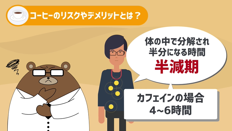 また、カフェインから体の中で分解されて、濃度が半分になるまでの時間、これを専門用語で半減期と呼ぶのですが、このカフェインの半減期が4-6時間とされています。あくまで濃度が半分になるまでの時間ですから、カフェインは結構長い間体に残るんですよね。
