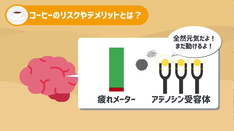 これは、本来眠くなったり、疲れたりするのは脳のアデノシン受容体、という所にエネルギーが使い果たされたあとのゴミである「アデノシン」という物質がスポットはまりこむ事で、脳が自分自身の体の疲れメーターを検知し、それに応じて疲労感や、睡魔を感じる仕組みなのですが、