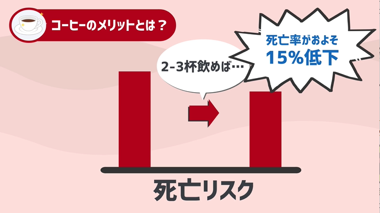 理由としては、コーヒーを習慣的に飲んでいる人は、心臓病、脳卒中、肺の病気などの病気での死亡リスクが下がったという結果になっており、コーヒーは様々な病気で命を落とす危機を食い止めてくれる効果を発揮してくれているのかもしれません。
