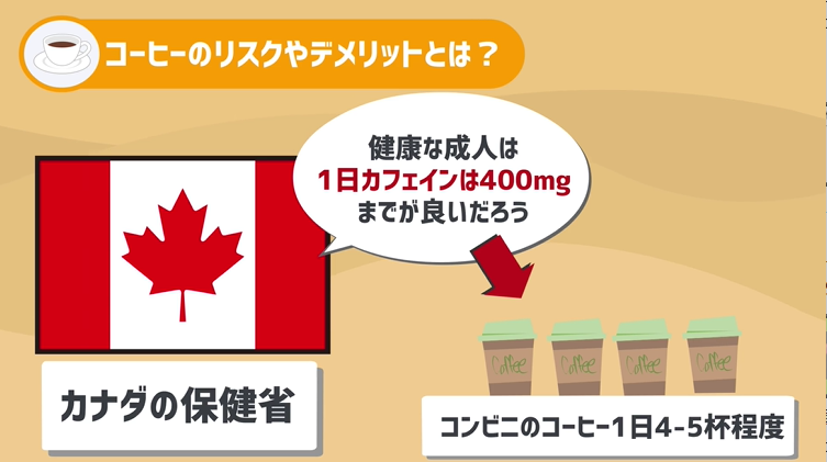 カナダの保健省では、こういった弊害を鑑みて、健康な成人は1日カフェインは400mgまでが良いだろうと提言しています。