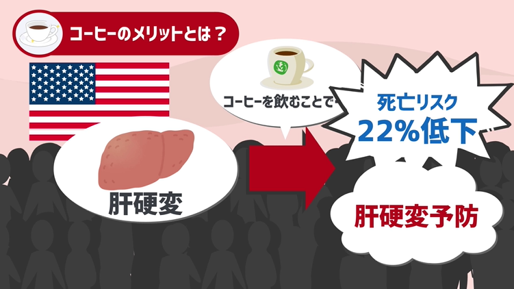 アメリカで120000人以上を対象に行われた研究では、肝臓がんの一歩手前の状態である肝硬変で死亡するリスクが、コーヒーを飲むことで22%下がった、こういう研究もあります。