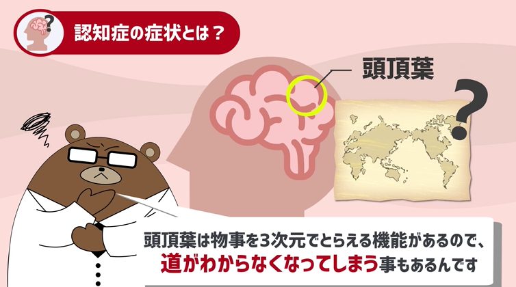 また頭頂葉は地理の感覚や、物事を3次元でとらえる立体でとらえる機能があるので、つまるところ頭頂葉の機能が落ちると道がわからなくなってしまう事もあるんです。