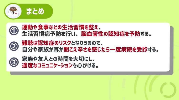 - 難聴は認知症のリスクとなりうるので、自分や家族が耳が聞こえ辛さを感じたら一度病院を受診する。
