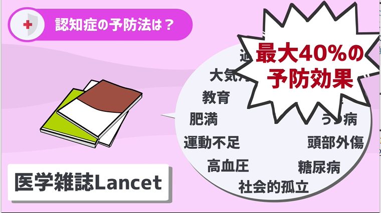 2020年に医学雑誌Lancetに掲載された発表では、この12個の認知症のリスクをできるだけ多く避ける事で、認知症の予防に繋がり、なんと最大40%の予防効果があると解説されています。