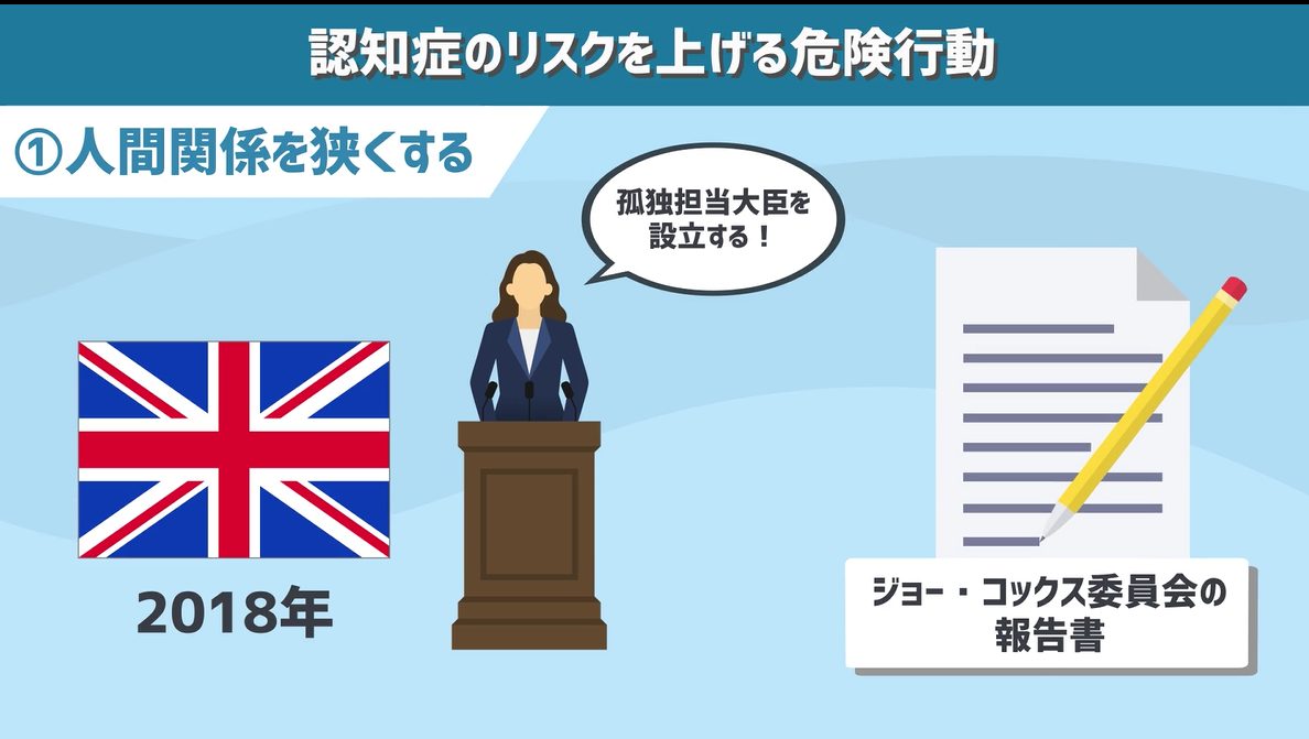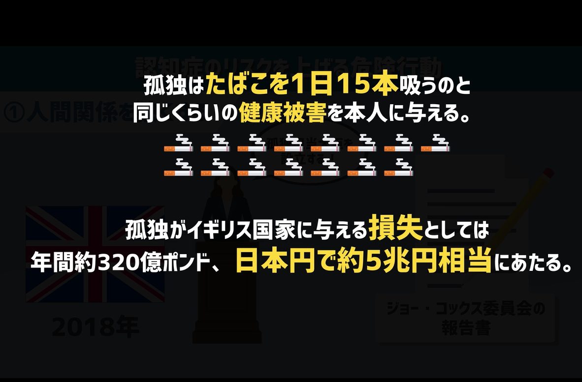 「孤独はたばこを1日15本吸うのと同じくらいの健康被害を本人に与える。そして孤独がイギリス国家に与える損失としては年間約320億ポンド、これは日本円で約5兆円相当にあたる」