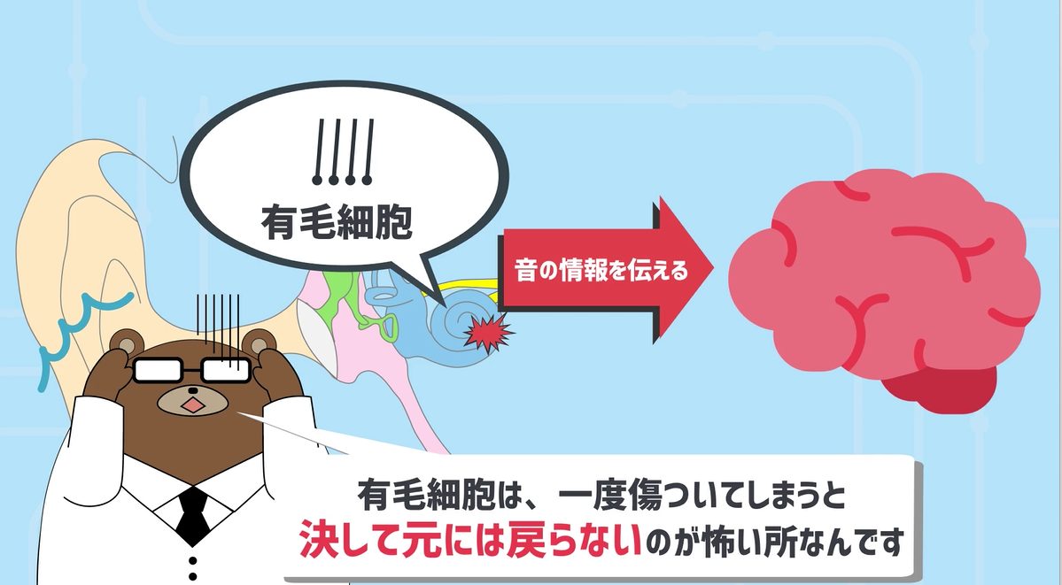 また、人間は大きな音に一定期間さらされると、耳の「有毛細胞」と呼ばれる、音の情報を脳に伝える毛のような細胞が抜け落ちたり、傷ついてしまうとされています。