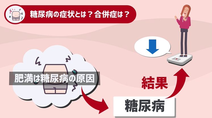 確かにその通り、肥満は糖尿病の「原因」となる事があるのですが、糖尿病が進行した「結果」としては体重が減ってしまう、実はこういう仕組みになっているんです。