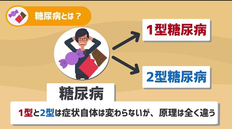 糖尿病には「1型」と「2型」の2パターンが存在します。症状自体は変わりませんが、実は原理は全く違うんです。