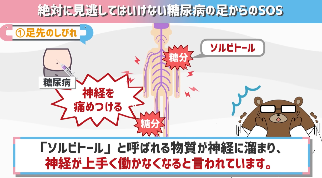 医学用語で「ソルビトール」と呼ばれる物質が神経に溜まり、神経が上手く働かなくなると言われています。