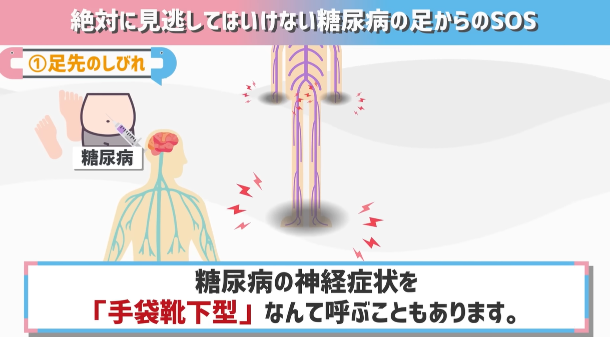 これは手でいうと手袋の部分で出ることもあるので、糖尿病の神経症状を「手袋靴下型」なんて呼ぶこともありますね。