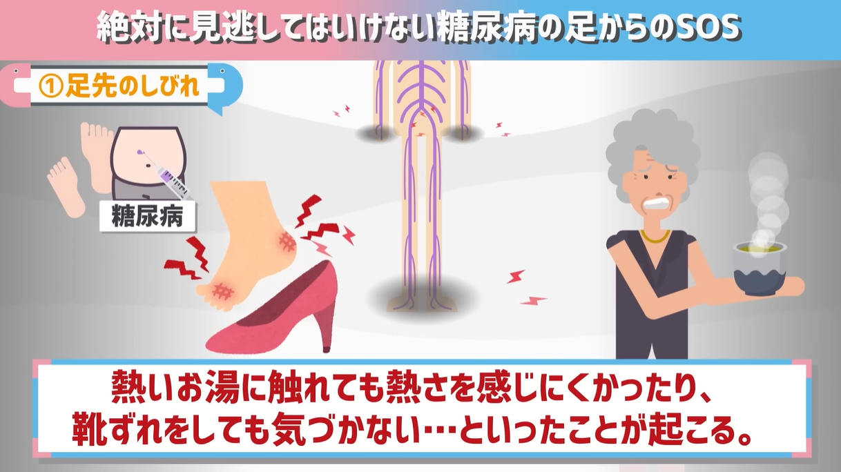 そして、症状がひどくなると、熱いお湯に触れてもあまり熱さを感じにくかったり、靴ずれをしても痛みがわからず気づかない…といったことが起こるんです。