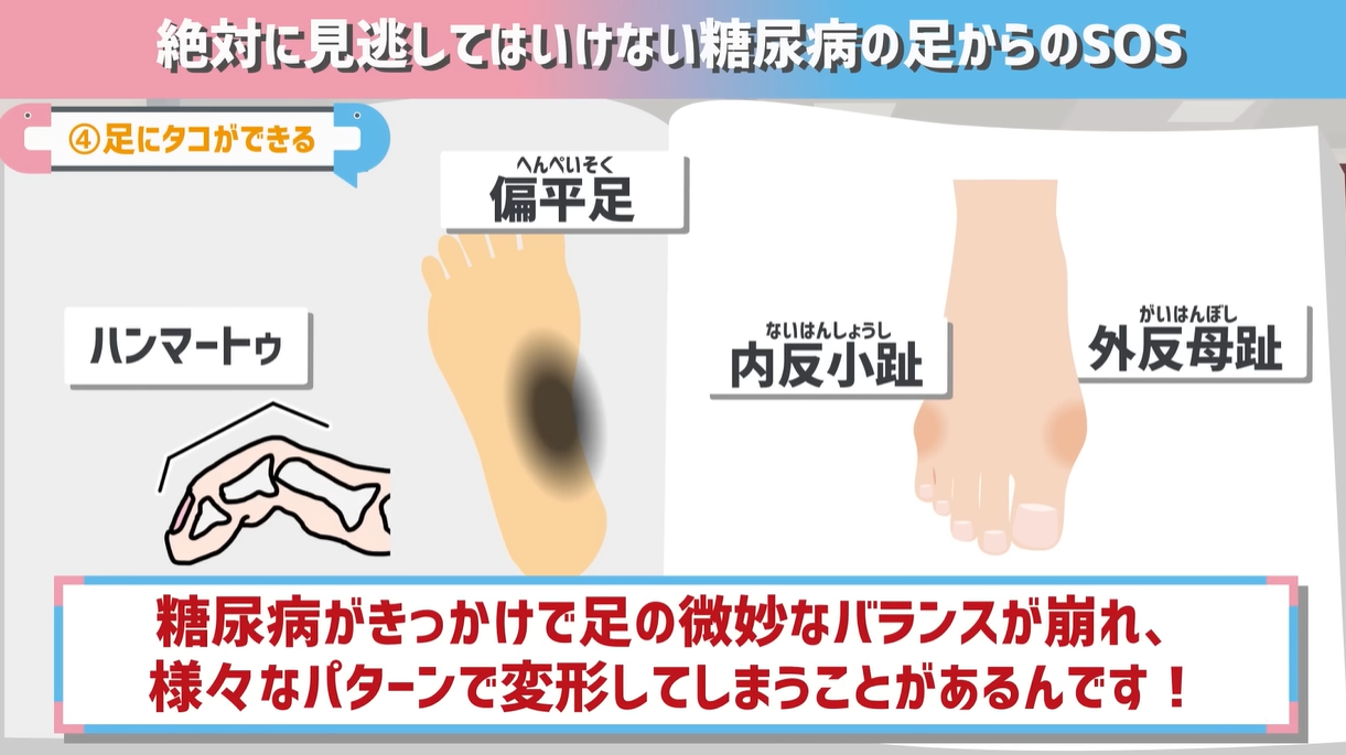 また、糖尿病では足が変形しやすく、外反母趾などになりやすいので靴や靴下も大事。