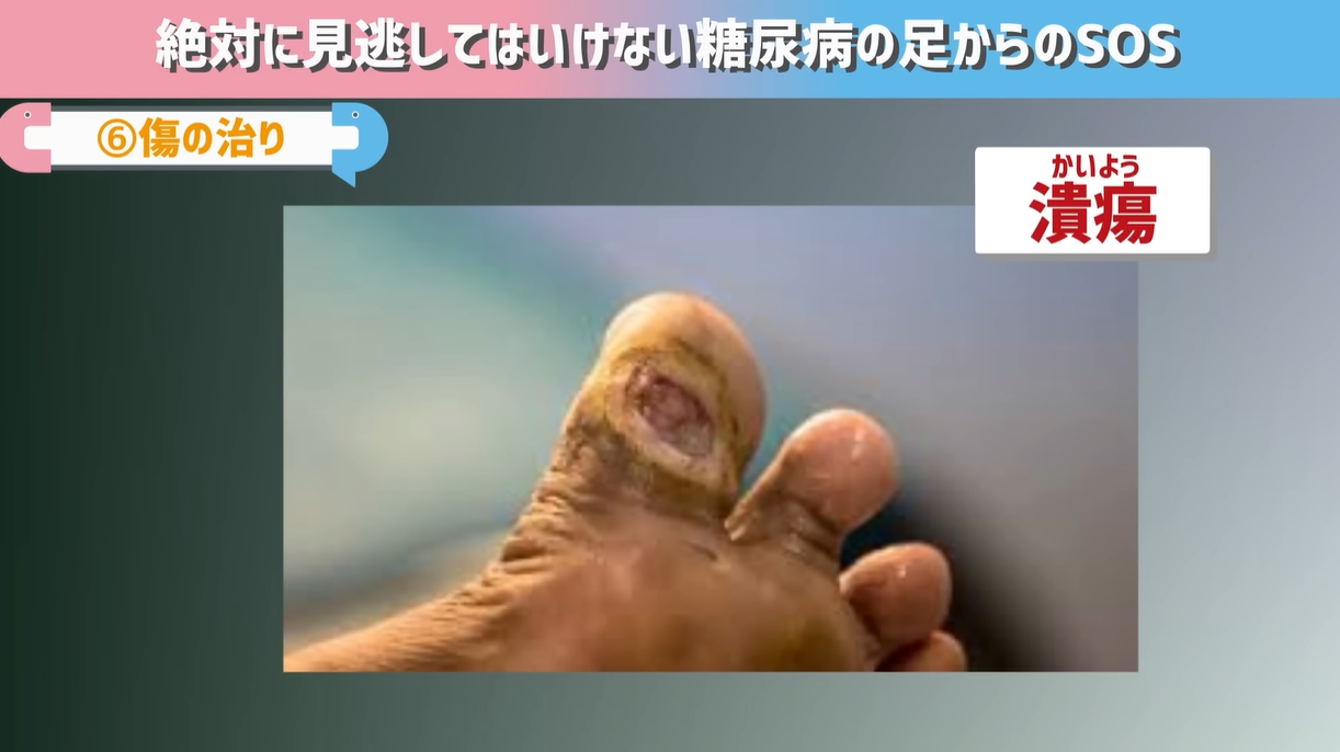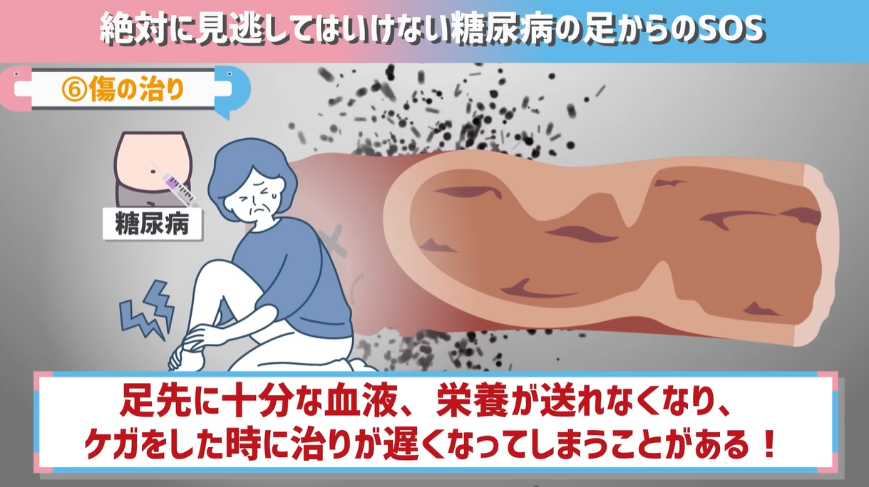 - 足の血管が傷つくことで栄養を十分に送れず、ケガをした時に治りが遅くなる