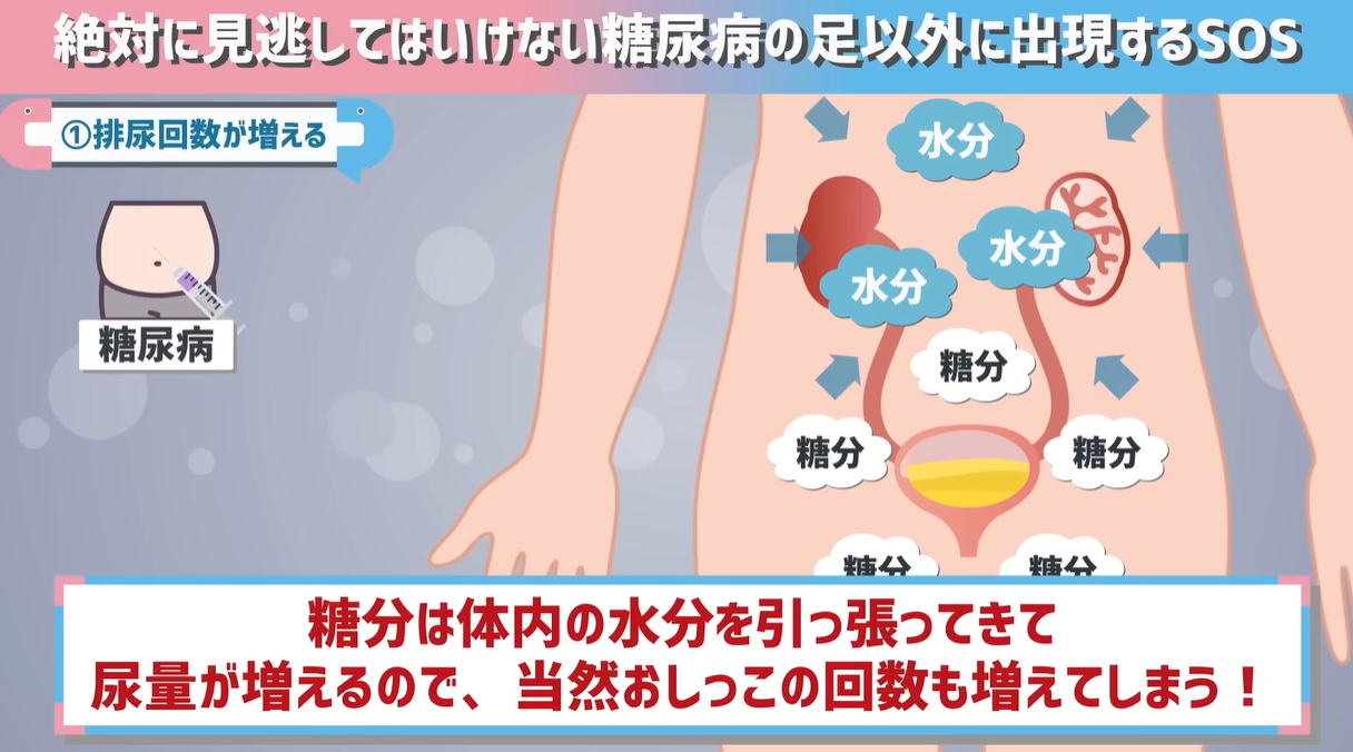 病気の名前の文字通り、糖尿病では尿、つまりおしっこの中の糖分の量が増えます。おしっこの中に糖分が増えると、この糖分は体の中にいる時は、水分を引っ張ってきて、おしっこの方に引き込むんです。