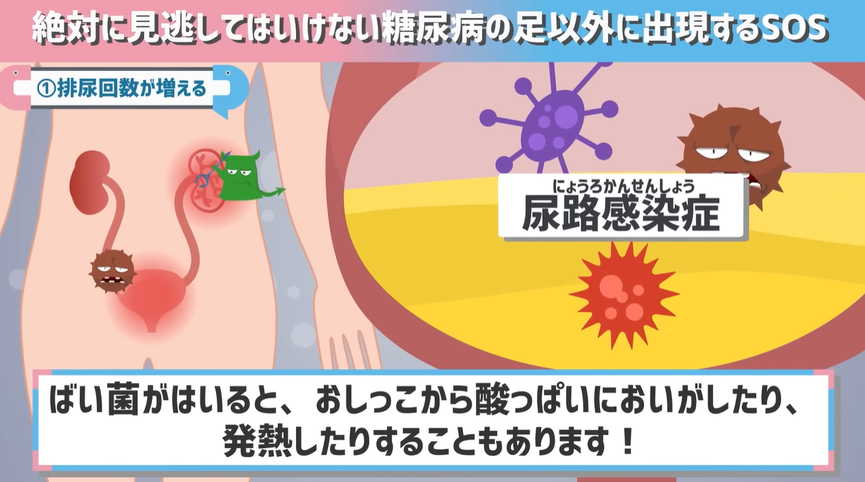 頻尿の原因が糖尿病が原因になる事もありますし、また専門用語で「尿路感染症(にょうろかんせんしょう)」と呼ばれる、おしっこにばい菌がはいる状態になりやすくなります。