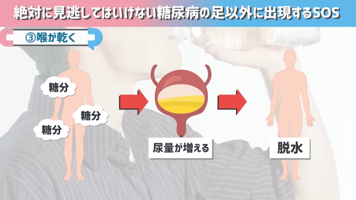 そして今度は糖尿病の状態が悪いとき、普段感じやすい症状でよくあるのが、「のどのかわき」です。