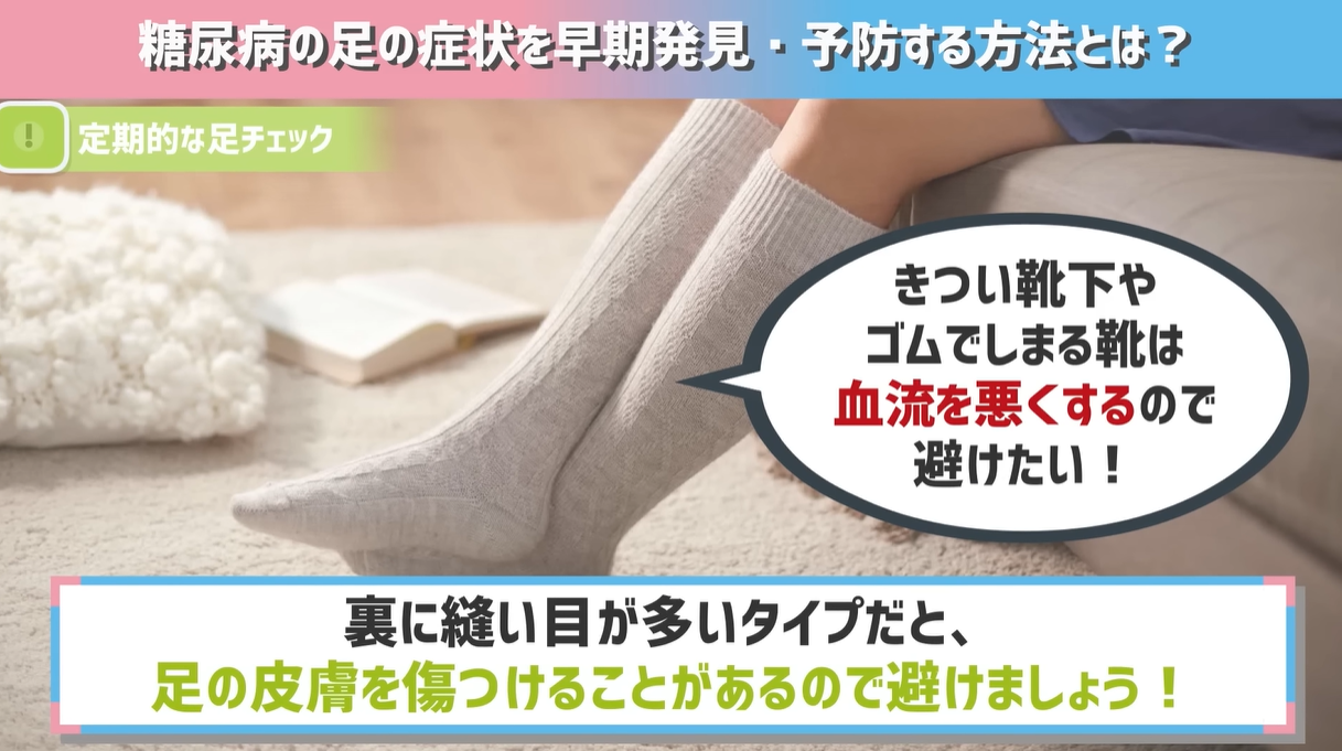 きつい靴下やゴムでしまる靴は血流を悪くするため避けたいですし、裏に縫い目が多いタイプだと、足の皮膚を傷つけることがあるのでさけましょう。