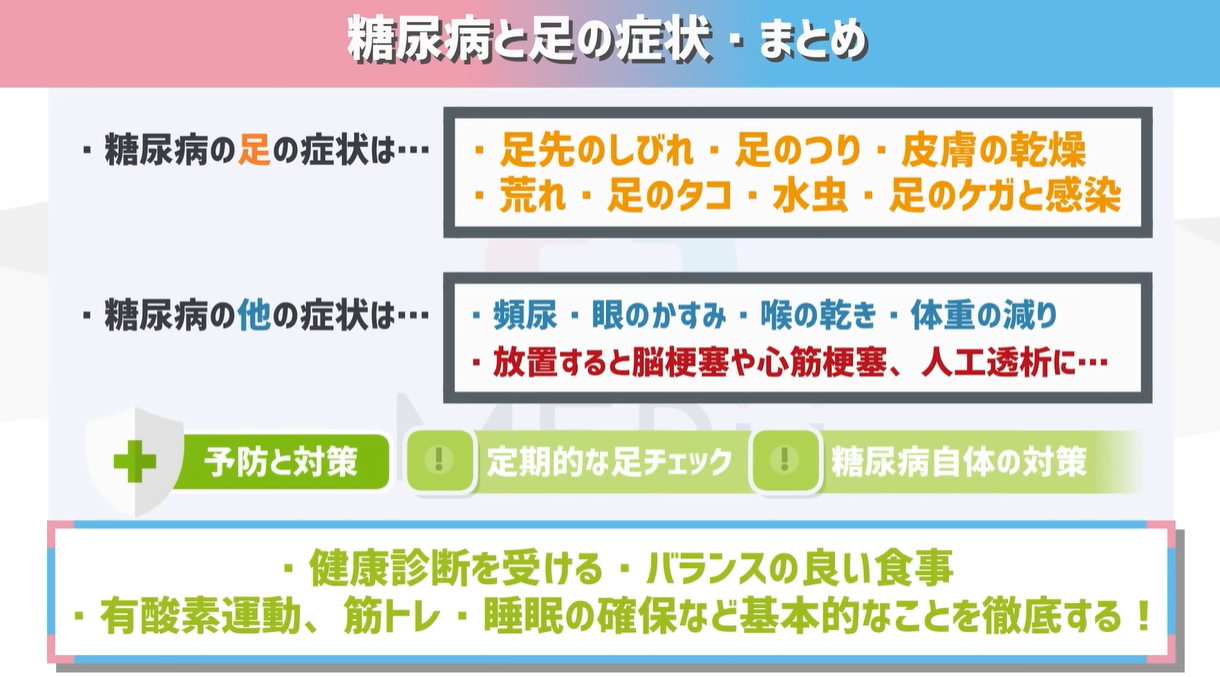 今回紹介した症状を放置しておくと、血管が痛んで動脈硬化が進行、心筋梗塞や脳梗塞に繋がったり、腎臓がダメージを追って「人工透析」を余儀なくされることもあります。日本の透析患者さんの中でも、糖尿病は原因の第一位。あらゆる面から油断できない病気が糖尿病なんですね。
