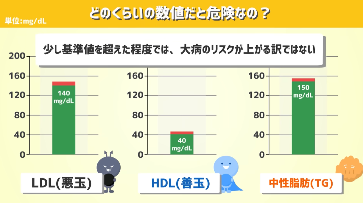 まず、基準値を見てみましょう。基準値はLDLは140、HDLは40、中性脂肪は150となっていて、この基準値を超えたり、下回ったりすると一応「脂質異常症」には当てはまります。