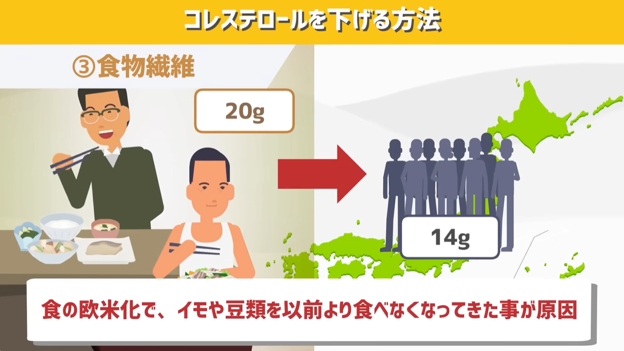 戦後の日本人は1日20gを超える食物繊維を摂取していたんですが、食事の欧米化に伴って、いもや豆類を以前より食べなくなってきたことでこんな状況になっているんです。