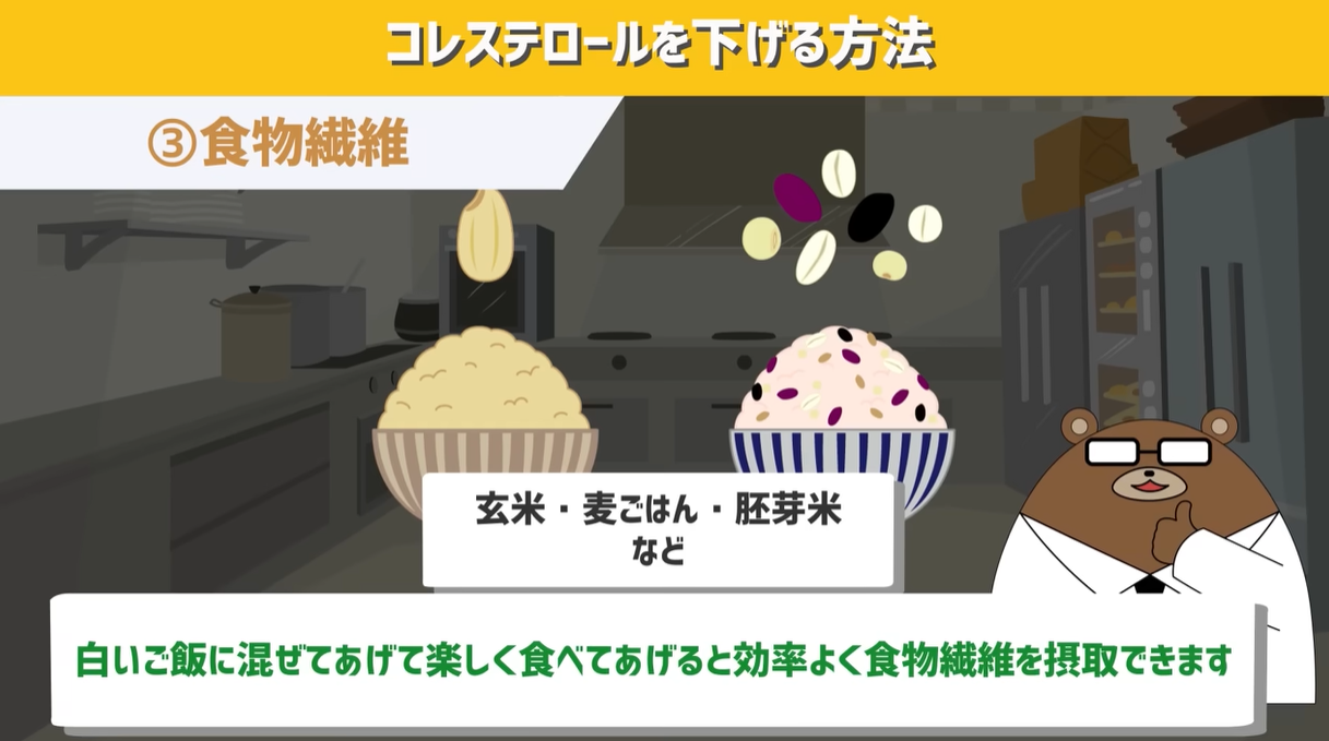 食物繊維はコレステロールから作られる「胆汁酸」を体の外に排泄してくれて、コレステロールの数値を下げる効果があるとされています。