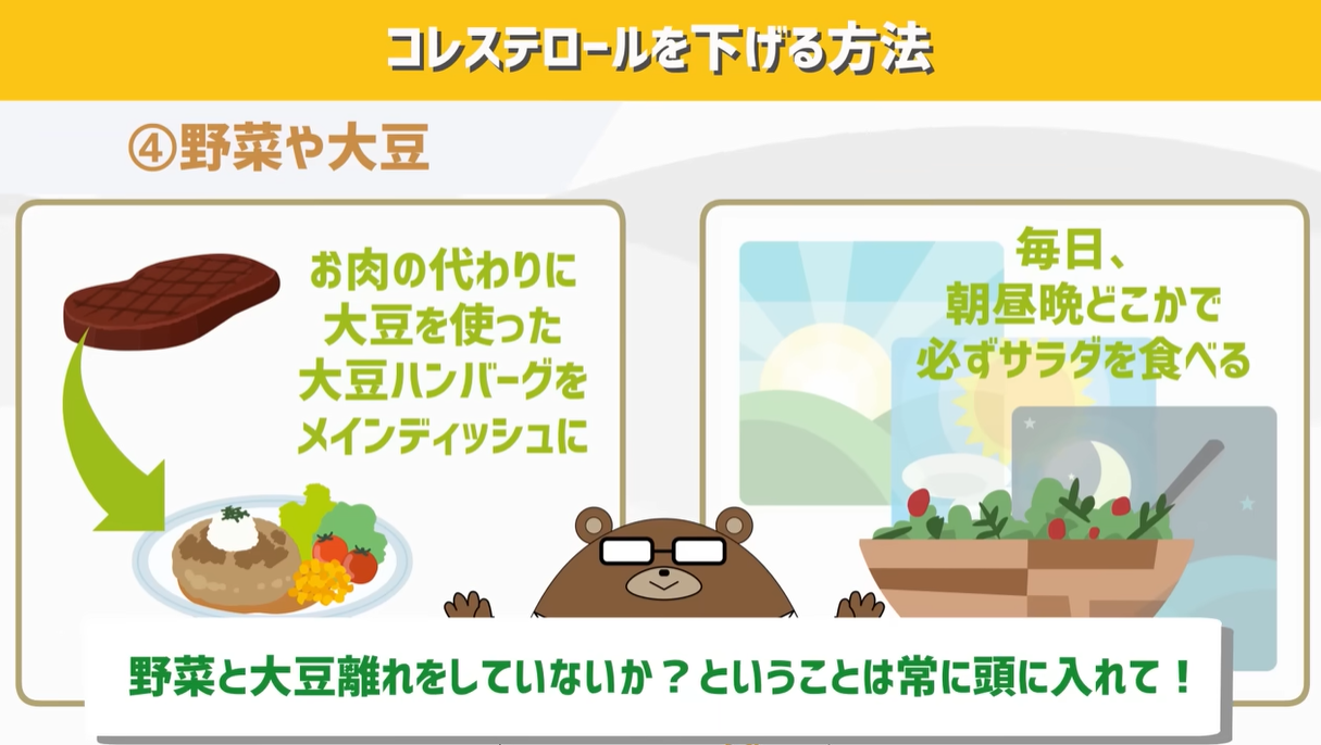 そして、食物繊維が多く含まれている食品でもありますが、野菜や大豆。これらもコレステロール対策にはかかせない存在。
