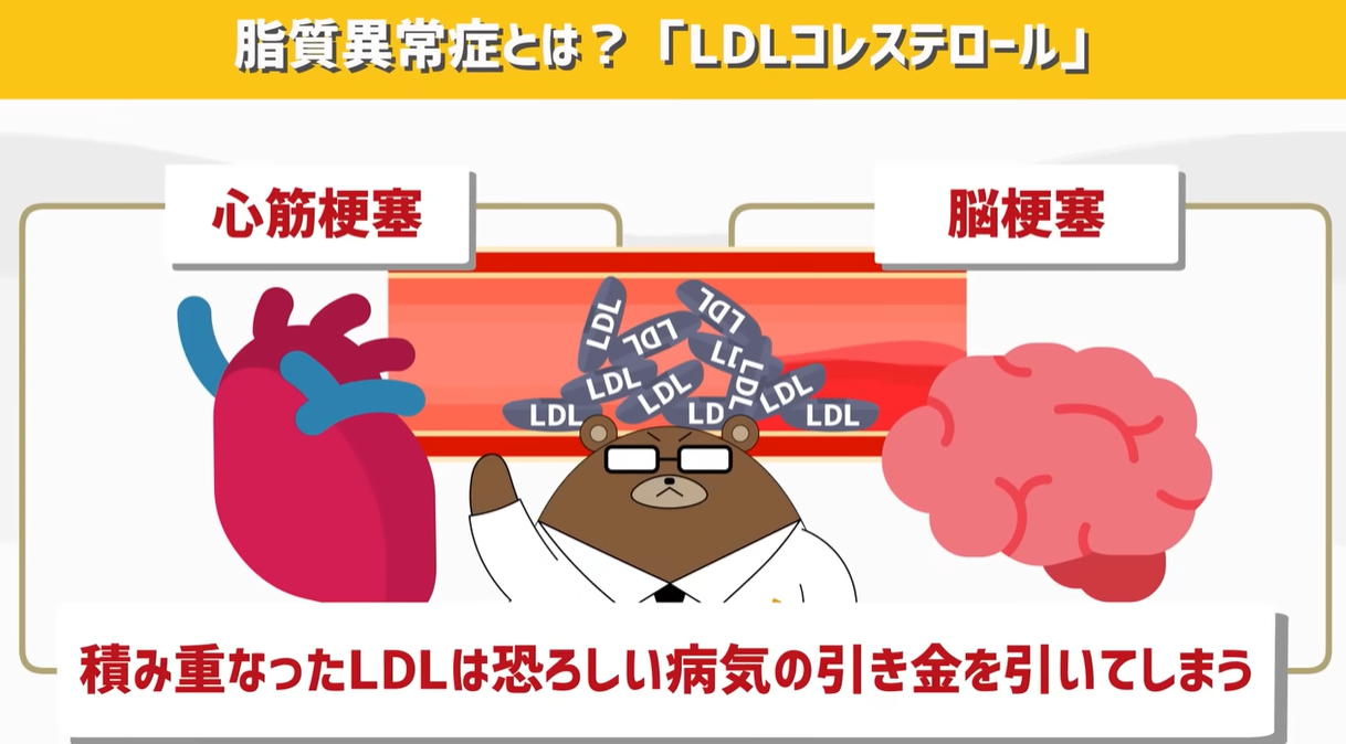 そしてこのLDLの暴走を放置してしまうと、最終的には積み重なったLDLにより血管が詰まり、心臓の血管が詰まれば心筋梗塞、脳の血管が詰まれば脳梗塞といった恐ろしい病気の引き金を引いてしまう訳なんです。