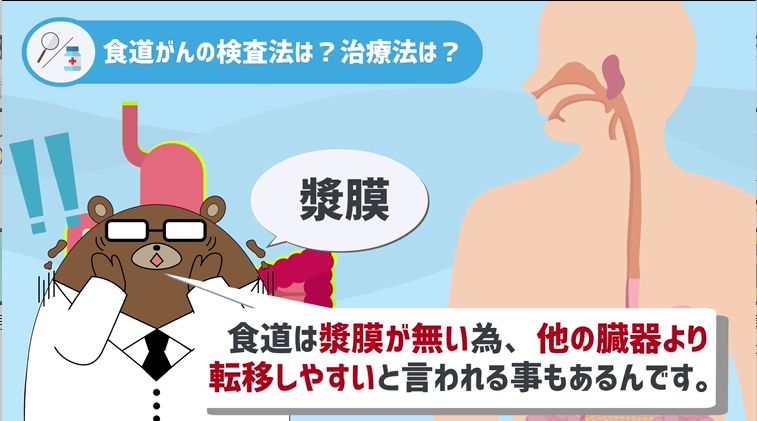 ちなみに食道に関しては、胃や腸など他の多くの臓器に存在する、臓器の一番外側を覆っている漿膜という膜が無い為、他の臓器より転移がしやすいと言われる事もあるんですね。