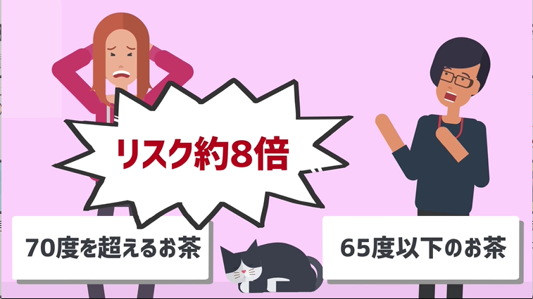 イラン北東部のゴレスタン州という地域で5万人を対象に行われた研究では、70度を超えるお茶を日常的に飲んでいる人は、65度以下のぬるいお茶を飲む人よりリスクが約8倍高かった、という研究結果が出ています。