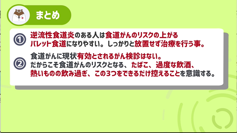また、がん検診に関してですが、データとしては現在食道がんに対して万人に有効とされる方法は存在していません。