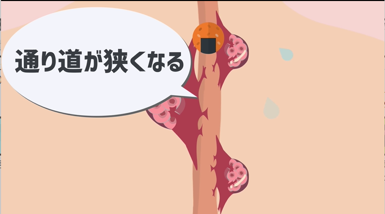 食道がんの腫瘍が大きくなってしまうと、だんだん食道の通り道が狭くなってきてしまい、食べ物が通り辛くなり、食べ物がつかえる感覚が出てくる場合があるんですね。この症状は皆さんのイメージ通りかもしれません。