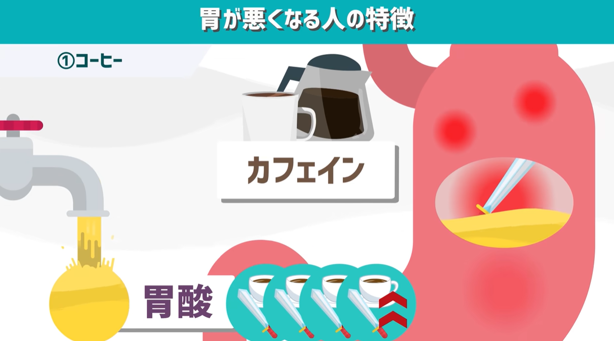 コーヒーのカフェインが胃酸の分泌を活性化する作用があると言われています。