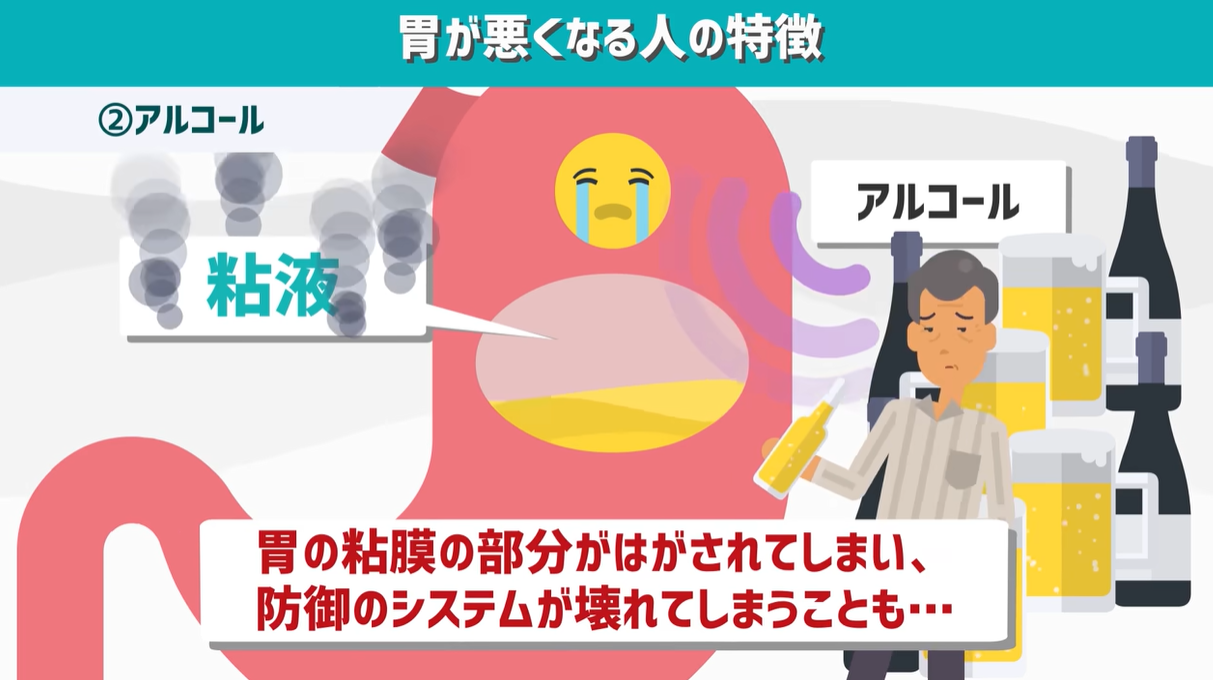 「お酒の飲み過ぎで胃が荒れてる…」なんて経験は一度はあるかと思いますが、まさにアルコールが粘膜のシステムを壊してしまったことが原因。