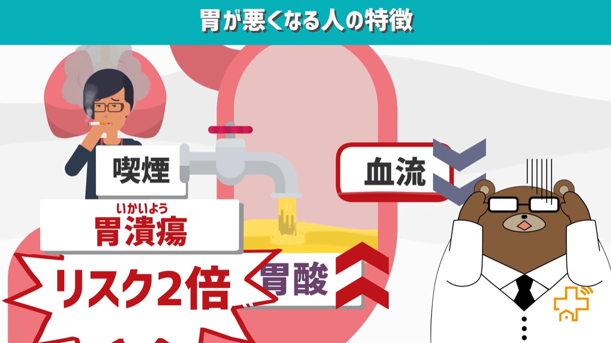 たばこを吸う行為も、胃の血流を悪くしたり、胃酸の分泌を増やしたりすることで、胃潰瘍のリスクとなる、とされています。