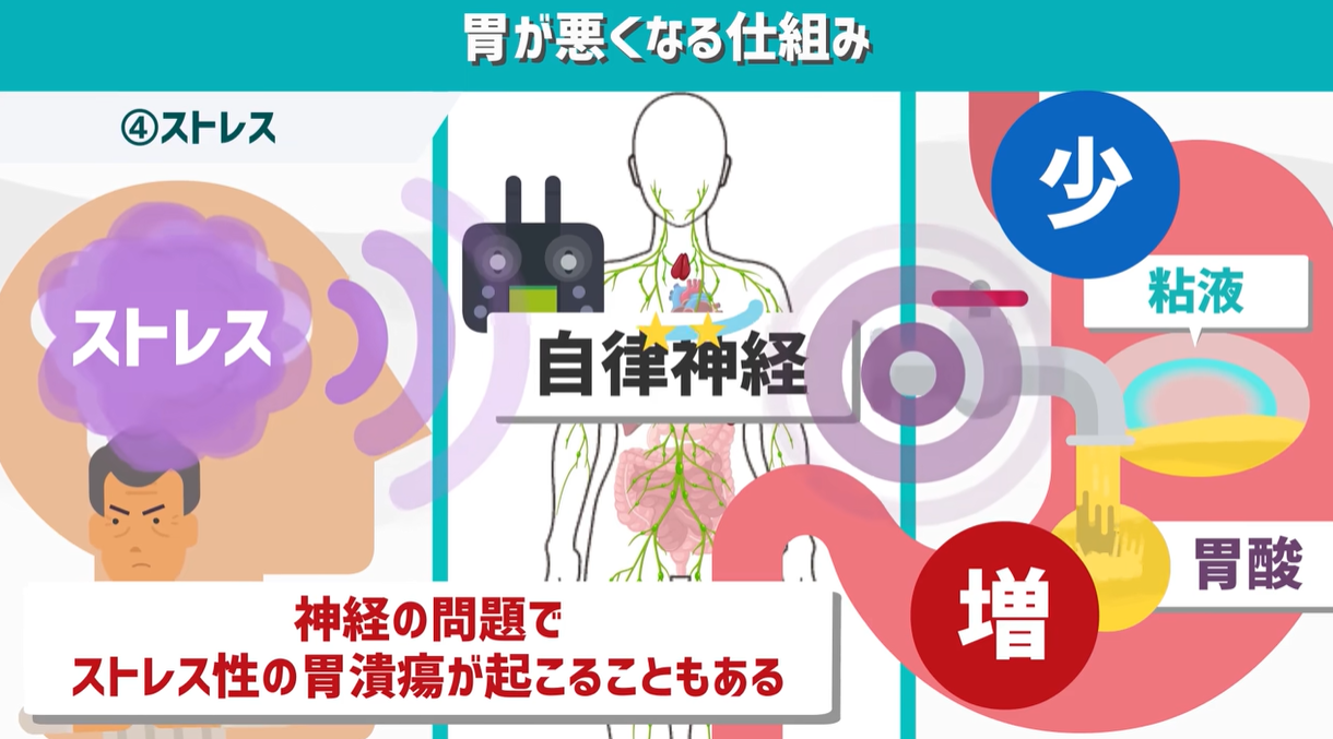 そして普段の生活の中で大きなストレスがかかると、そのストレスが自律神経を混乱させてしまい、胃酸の量が増えたり、粘液が少なくなったりします。