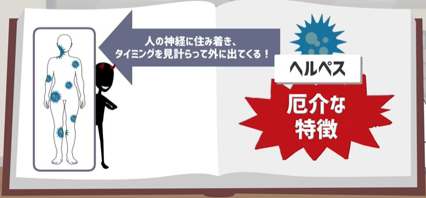 ヘルペスウイルスの非常に厄介な特徴なんですが、なんと「感染が落ち着いてからも人の神経に住み着き、タイミングを見計らって外に出てくる」こんな性質を持っているんです。