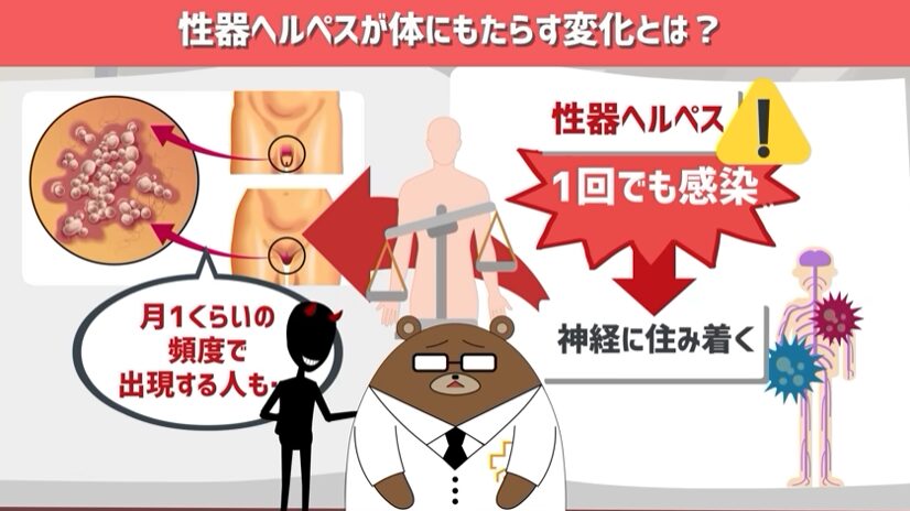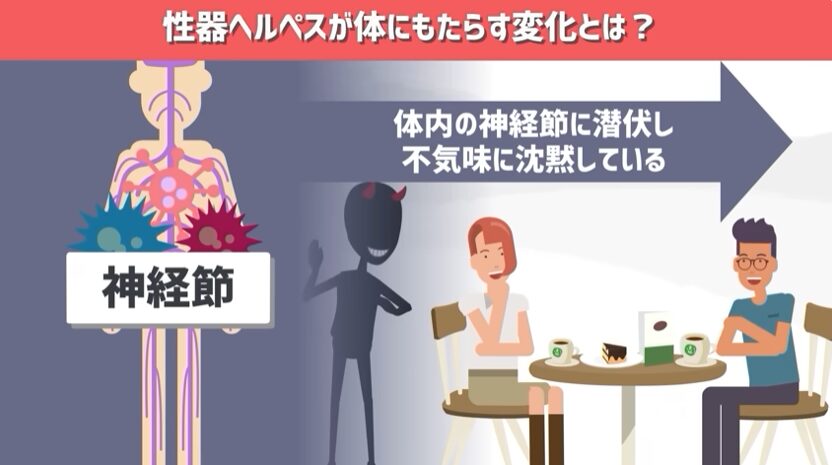 性器ヘルペスに1回でも感染してしまうと、彼らは私たち体の神経に住み着くようになり、自分の体調のバランスが少し崩れると、ヘルペスウイルスが性器の所からこんにちはと顔を出してくるようになる、こういうことなんです。