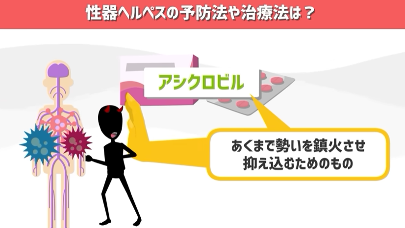 また、性器ヘルペスにかからないため以外の再発を防ぐための予防法として、性器ヘルぺスを1年に6回以上再発する人や、再発による痛み・ストレスが大きい人には、長期的にバラシクロビル(Valacyclovir)という抗ヘルペスウイルス薬を服用する「抑制療法」も行われています。