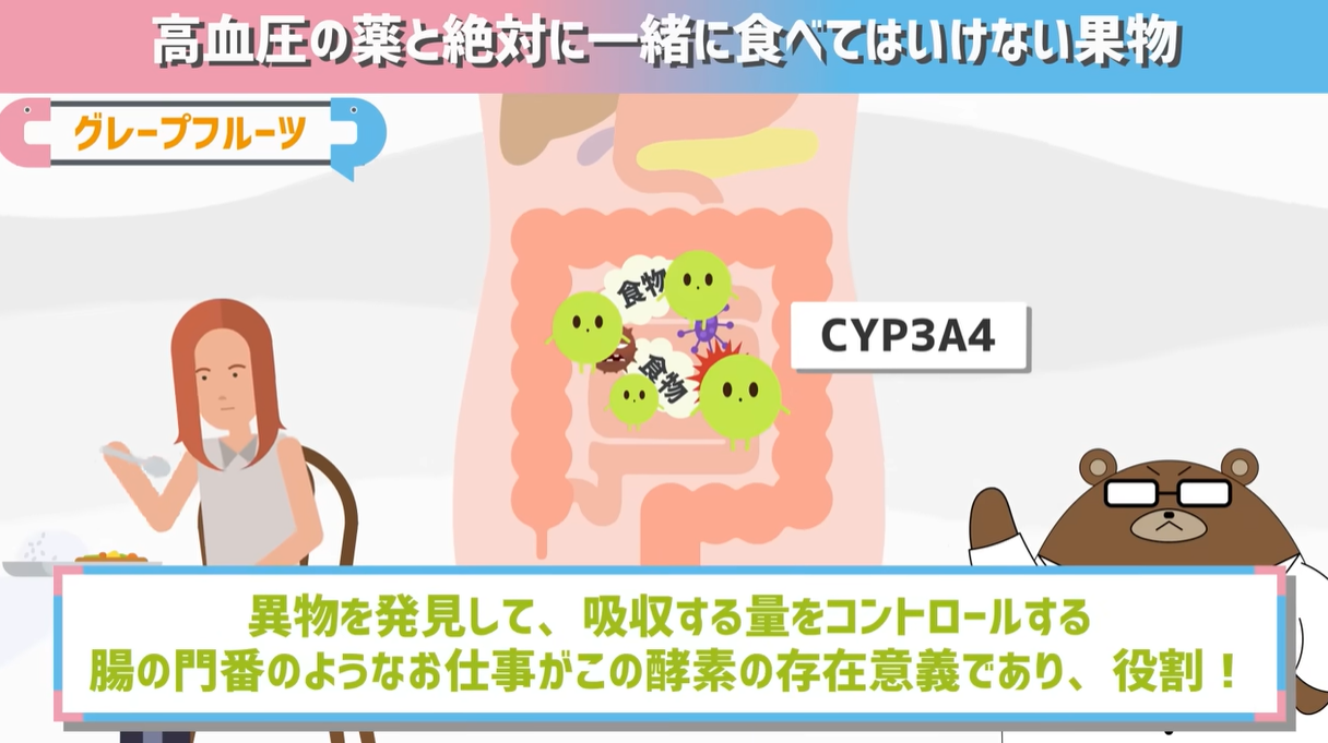 そして、実はこのお薬が腸から吸収される量を調整してくれているバランスをとる係、通称CYP3A4という酵素が、小腸には存在しています。なぜこんなやつが存在するのかと言えば、人間が食事などをすると、異物を含め様々な物質が腸に流れこんできます。