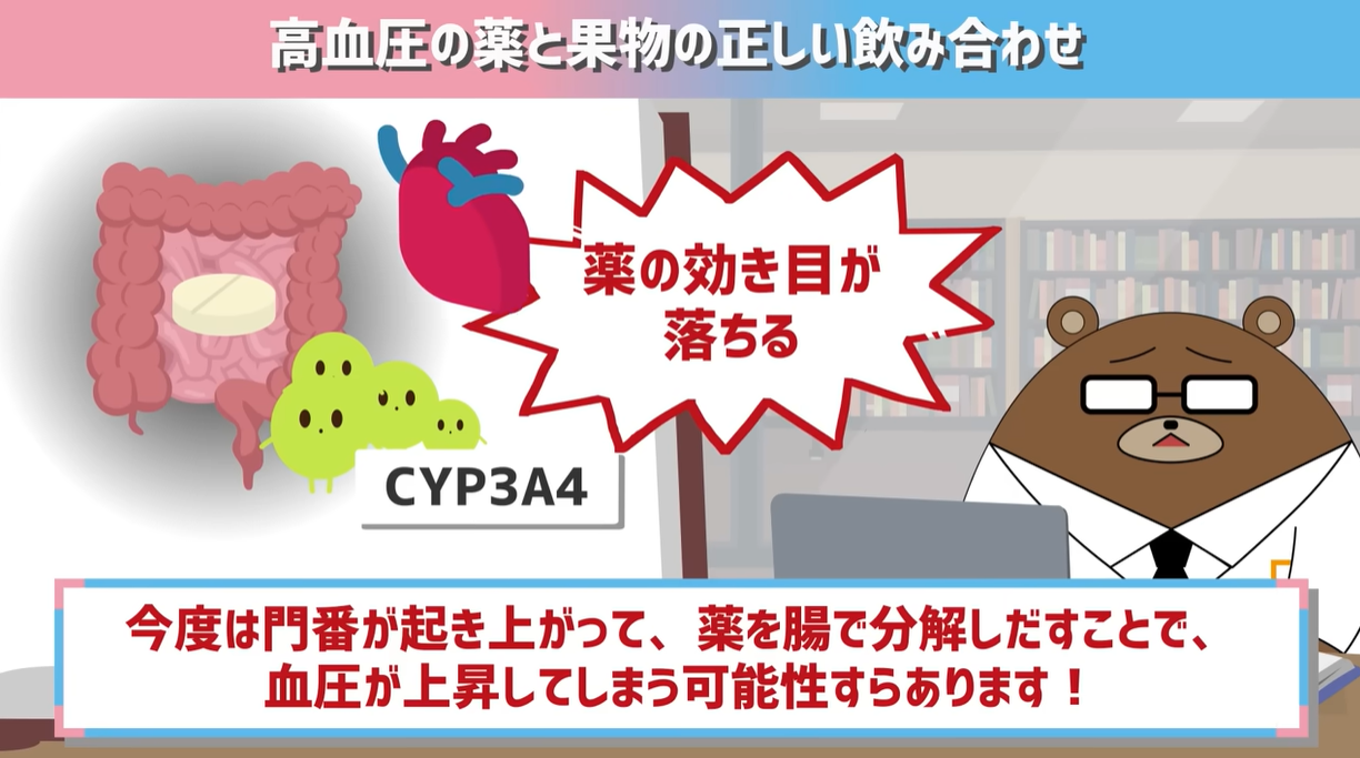 そのため、今グレープフルーツを日常的に食べる生活をしていて、「血圧の薬を飲んでいて数値が安定している。副作用も起きていない。」という場合は逆に、やめると今度は門番が起き上がって、薬を腸で分解しだすことで血圧が上昇していまう可能性すらあります。すぐに緊急で生活を変える必要はありません。