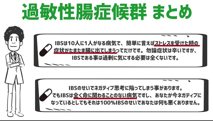 - 症状は辛いが、IBSを過剰に気にする必要は全くない