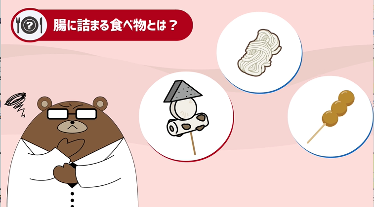 なので、時期でいうと、正月はおもちに昆布巻きに食べる人が多いでしょうし、正月早々腸が詰まって入院なんて最悪ですから、正月は特に念入りに食べ物をよく噛んで食べたい所ですね。