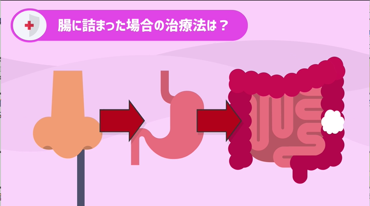 そして治療に関しては、今説明したように上流の部分の圧力が強くなっているので、圧力を弱めるために、部位によっては鼻からチューブを入れてあげて、圧を抜いてあげる事があります。この鼻からチューブを入れる工程がかなり苦しく、苦手な人が多いですね。